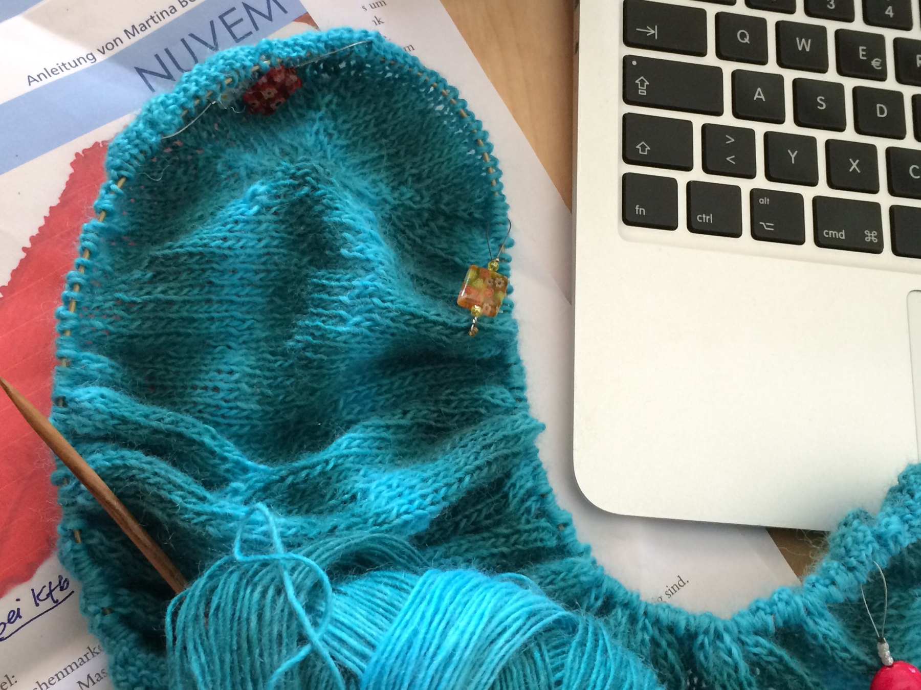 Und wenn die Socken dann mal wieder alle von den Nadeln sind, dann braucht man natürlich ein anderes, einfaches, hirnloses Zwischendurchprojekt, dass man überall rausholen kann und an dem man dann ohne nachzudenken einfach weiterstricken kann. Nach langen Hin und Her habe ich mich vergangene Wochen entschieden, doch mal einen Nuvem anzuschlagen. Ich bin gespannt wie das läuft. Der Anfang war schnell gemacht und das Garn mit dem türkis-grünen Farbverlauf ist hinreichen motivierend. Aber es ist schon SEHR viel glatt rechts.