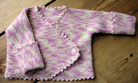 A while ago I saw the cute baby jacket in Cecie’s blog and I knew I had to knit one, too. Instead of the stated Alpaca yarn by Drops I used a lofty bamboo yarn which somehow seemed more appropriate for the warmer season. Plus, it’s machine washable. Who wants to wash baby clothes by hand, I ask you?! I am particularily enamoured with the cute picot edging 🙂