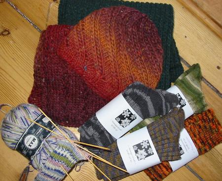 Right now I’m feeling pretty good about my finished Christmas presents. As you can see in the picture there is one pair of socks still in the making but being on holiday should give me ample time to finish it in time and maybe even cast-on another project. The picture of the single pair of socks shows a pair intended for my father in law and it didn’t make it into the pig picture because it was still drying on the line. I’m really taken by the narrow stripes and the subtle colors of the Regia Canadian Color yarn.