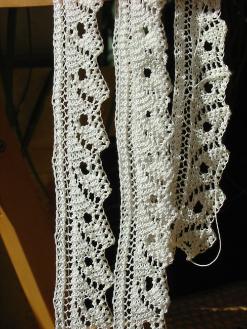 Diese Bordüre ist aus dem Buch „Heirloom Knitting“ und ist gestrickt aus Coats Aida #20 auf 2 mm Nadeln. Insgesamt sind es 2 x 60 cm Bordüre. Ursprünglich sollte die Spitze eine Chiffonstola zum Hochzeitskleid schmücken. Aber die wurde ja dann wegen des kühlen Wetters durch einen Shrug ersetzt. Mal sehen wofür man die Spitze noch so verwenden kann.