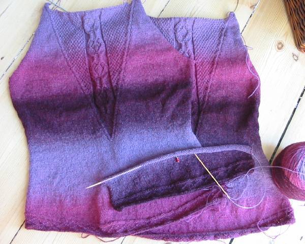 Ich stricke meinen Elizabeth I aus Kauni Effektgarn auf 3 mm Nadlen. Vorder- und Rückenteil werden gleich gestrickt. Verbraucht habe ich für die beiden Teile knapp einen 250g-Strang Kaunigarn. Für die Ärmel habe ich einen neuen Strang begonnen. Der Farbverlauf ist toll und super spannend beim Stricken. Es wird nie langweilig, trotz der Tatsache, dass man praktisch nur glatt rechts strickt.