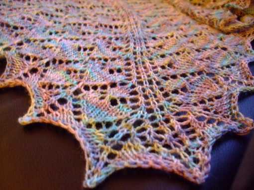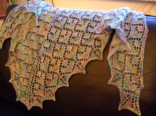Die liebe Patentante des besten Ehemannes von allen wurde 80 und wir waren zur großen Feier geladen. Da stellt sich natürlich die leidige Frage, was schenkt man einer rüstigen, alten Dame, die natürlich behauptet, bereits alles zu haben, was man je brauchen kann. Ein kleines Tuch/ein Schal machen sich bestimmt gut zum Mantel oder einfach nur wenns um den Hals rum etwas zugig wird. Das handgefärbte Garn ist zwar etwas sehr belebt was die Farben angeht, funktioniert aber trotzdem halbwegs mit dem einfachen, geometrischen Lochmuster. Und das Tuch strickt sich schnell und unkompliziert, da es sehr einprägsam ist. Ursprünglich hatte ich das wertvolle Cherry Tree Hill Supersock Garn ja tatsächlich für Socken aufgehoben. Bei näherer Betrachtung schien mir 100% Wolle allerdings nicht so praktisch für Socken des täglichen Gebrauchs. Meine Füße sind ziemlich rabiat zu meinen Socken und reines Wollgarn ist zu schnell durchgelaufen.