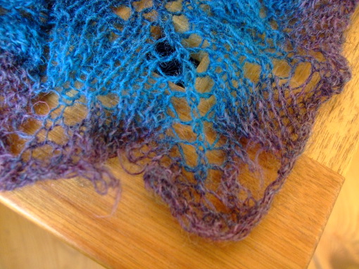 Letzte Woche musste ich mit Entsetzen feststellen, dass in meinem schönen Icarus-Shawl mehrere Löcher waren. Mein erster Gedanke war: MOTTEN!!!!! Aber eine genauere Untersuchung zeigte, dass der Shawl wohl einfach nur Opfer der zahlreichen Klettverschlüsse geworden war, die ich sowohl an meiner Allwetterjacke als auch an meinem Messengerbag habe. Diese waren wohl doch zuviel für das einfädige Evilla Lace-Garn, welches an manchen Stellen nicht dicker als Nähfaden war. Glücklicherweise konnte ich den Rest des ursprünglichen Garns noch aus einer Restekiste zaubern und nach ein bißchen Faden abwickeln und Farben vergleichen habe ich es hinbekommen, die vier Löcher alle halbwegs unsichtbar zu reparieren. Uff. Was bin ich erleichert.