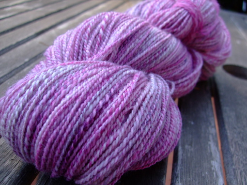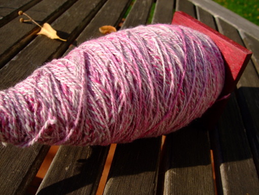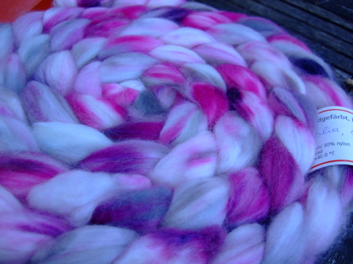 It’s not as if I wouldn’t own a sizable stash of yarn and fiber to choose from. How does one choose fiber for the next project anyway? Well, this nice and soft Merino/Nylon top in the tempting colorway ‚Magnolia‘ was calling to be spun as soon I had opened the parcel it came in from Zauberwiese. I divided the combed top in two halves and spun up each half on one of my two latest Kevin Rhodes spindles. Since I had 130 grams of this fiber in total I didn’t dare using my wheel for plying because I was afraid the bobbin might be too small for the whole finished yarn and I was really not keen on breaking this lovely yarn. Alas, what’s all those lovely spindles for? I knew I could easily fit 130 grams of a fingering weight 2-ply yarn on one of the larger spindles in my collection. The Quad from Tom Forrester did its job beautifully and my appreciation for spindles as a powerful fiber tool even grew, if that’s at all possible.