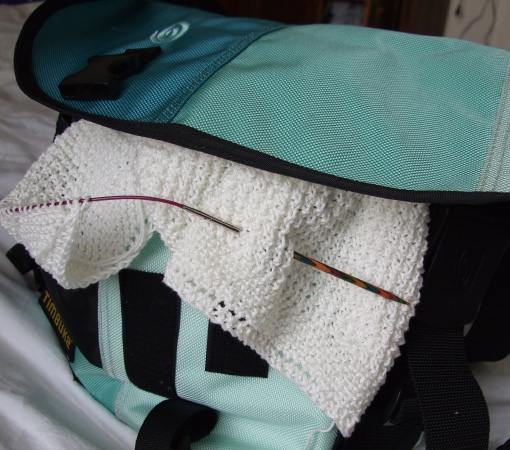 Diese Decke folgt einer einfachen schrägen Konstruktion. Gestartet wird mit drei Maschen und es wird am Anfang und Ende jeder zweiten Reihe jeweils eine Masche zugenommen bis die gewünschte Seitenlänge erreicht ist oder man durch die Hälfte des vorhandenen Garnes durch ist. Als Grundmuster dient das einfache aber doch interessante große Perlmuster mit einer krausrechten Kante. Das ist gerade interessant genug, dass man dabei nicht einschläft aber doch simpel genug, um 30 heruntergefallene Maschen einfach wieder aufzusammeln, wenn Babygirl mal wieder zu enthusiastisch am Kabel der Nadel gezogen hat – bitte keine Nachfragen bitte, wieso ich das so genaug weiß 😉