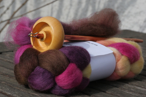 Bosworth Mini spindle in English Boxwood. Fiber: ‚Chromatic Composition‘ by Into the Whirled. Special Spindle+Fiber lottery in January 2012.