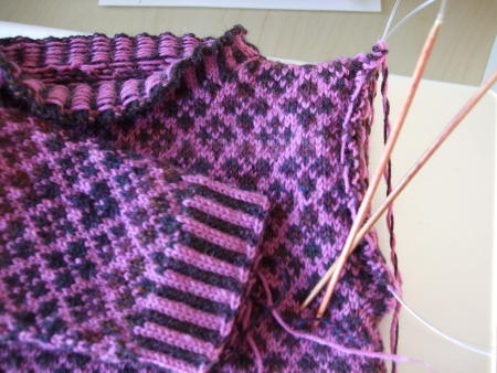 Auch wenn es nur langsam voran geht, so geht es doch stetig voran mit dem Fair Isle Übungsstück. Immerhin bin ich nun schon am zweiten Ärmel angekommen.