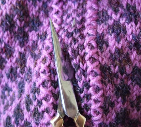It’s slow going but at least the Fair Isle practicing object is progressing steadily. The second steek is cut and therefore the second sleeve is in the making.
