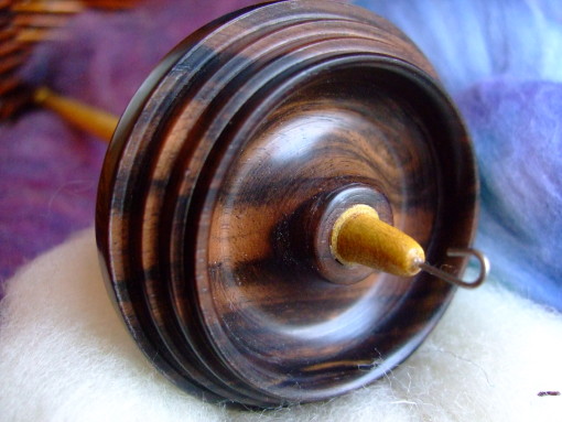 Am Tag vor meinem Geburtstag ist nach 3 Wochen langer Reise eine neue Spindel bei mir eingezogen. Gemeinsam mit Elizabeth Daily von Greensleeves Spindles habe ich Holz für Wirtel und Schaft ausgesucht und Elizabeth hat die Spindel dann für mich gemacht. Sie ist sehr schön und gut ausbalanciert. Da Ebenholz eine sehr hohe Dichte hat, ist die Spindel ein wenig schwerer als erwartet, aber sie läuft ganz wunderbar. Und die Maserung des Ebenholzes sieht einfach toll aus. Zur Spindel dazu gehört noch eine Butcher’s Crown. Hierbei handelt es sich um ein cleveres, kleines Teil, welches des Haken der Spindel beim Transport vorm Verbiegen schützt.