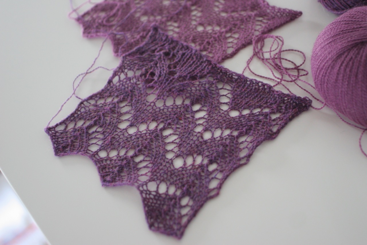 Meinen kleinen Strang Yak Lace habe ich zunächst einmal zu einer Maschenprobe mit einem Lochmuster verstrickt und im Vergleich dazu die Piura von Lamana in einer ähnlichen Farbe. Das Garn ist wirklich etwas besonders und ich denke, es macht sich besonders für Lace-Strickerein ganz ausgezeichnet. Das Garn ist weich, piekst nicht, entwickelt eine ganz leichte Halo und das Lochmuster öffnet sich sehr schön auch ohne aggressives Spannen. Einmal trocken scheint es die Form sehr gut zu halten. Es hat einen besonderen Griff, nicht so geschmeidig und flutschig wie Alpaka oder Seide und ist kompakter als Wolle. Jetzt muss ich mich nur noch entscheiden, was ich mit meinen 400 m Garn mache.