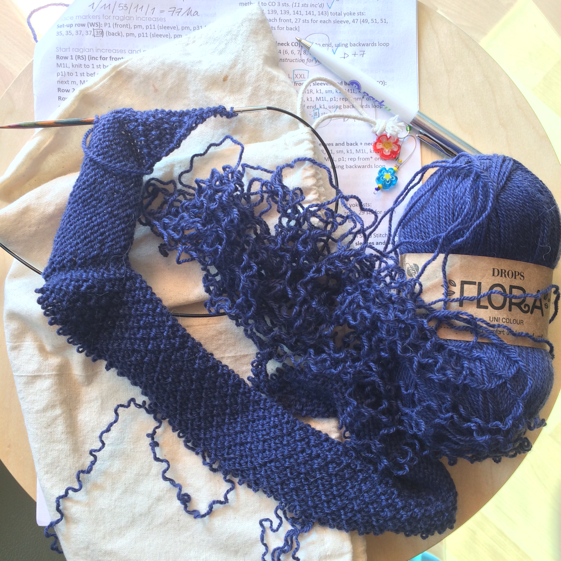 Einen kleinen Haken hat das ganze allerdings noch. Ja klar, wäre ja sonst auch zu einfach. Ich finde der Dexter hat besonders in den großen Größen einen SEHR engen Halsausschnitt. Zu eng für meinen Geschmack. Meine Idee: am Anfang für den Rücken und die Fronten insgesamt 30 Maschen mehr anschlagen und diese dann in der Zunahmereihe nach der Perlmusterpasse rausrechnen. Mittlerweile bin ich auf dem Weg zur Abteilung der Ärmel und ich denke, ich habe es hinbekommen. Ohne ribbeln ging es allerdings nicht. Man sollte das vorher eben doch noch mal etwas gründlicher durchdenken.