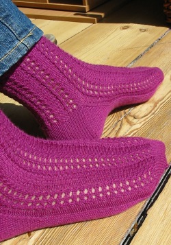 Not quite fitting for this wonderful summer wheather – my latest pair of socks which got finished at Wednesday’s knitting meeting. Although, coming to think of it, the color as well as the lacy pattern kind of makes it a lovely pair of summer socks anyway. The little chart can be used if you want to work a pair for yourselves.