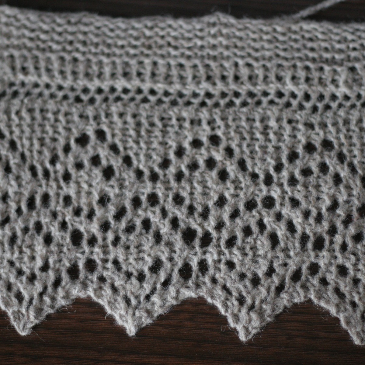 Wenn alle Maschen des Hauptteils aufgebraucht sind, dann wird abgekettet. Damit alles schön aufgeht und man am Ende keine halben Zacken hat, sollten für das gezeigte Muster am Hauptteil eine Gesamtmaschenzahl mit einem vielfachen von acht vorhanden sein. Am besten noch zwei Maschen mehr, dann kann man am Anfang eine extra Reihe zur Stabilisierung stricken und am Ende für’s Abketten ist auch noch eine Masche da.