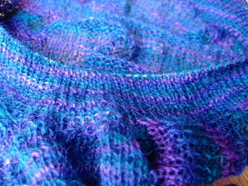 Was das Stricken betrifft, so bin ich seit einer Woche fieberhaft dabei, einen Whisper Cardigan zu stricken. Dieses Sommerjäckchen lebt davon, dass ein feines Lacegarn auf relativ dicken Nadeln gestrickt wird und dadurch ein luftig leichtes Gestrick entsteht. Ich hatte da dieses wunderschöne Mohair/Merino-Garn von Touch Yarns hier liegen, welches ich mir vor Jahren einmal aus London mitgebracht hatte. Irgendwie konnte ich mich nie so recht zu einem Projekt mit diesem kostbaren neuseeländischen Garn entschließen. Aber dieses Jäckchen, das sollte es sein. Der Anfang war etwas gewöhnungsbedürftig, da die Nadeln viel zu dick schienen und das glatt rechte Gestrick auch arg schrumelig und unordentlich aussieht. Aber nach einer Weile gewöhnt man sich dran und ich denke, Waschen und Spannen werden das Ganze richten. Besonders schön ist, dass die Jacke komplett nahtlos gearbeitet wird. Es gibt also praktisch nichts zu vernähen. Super.